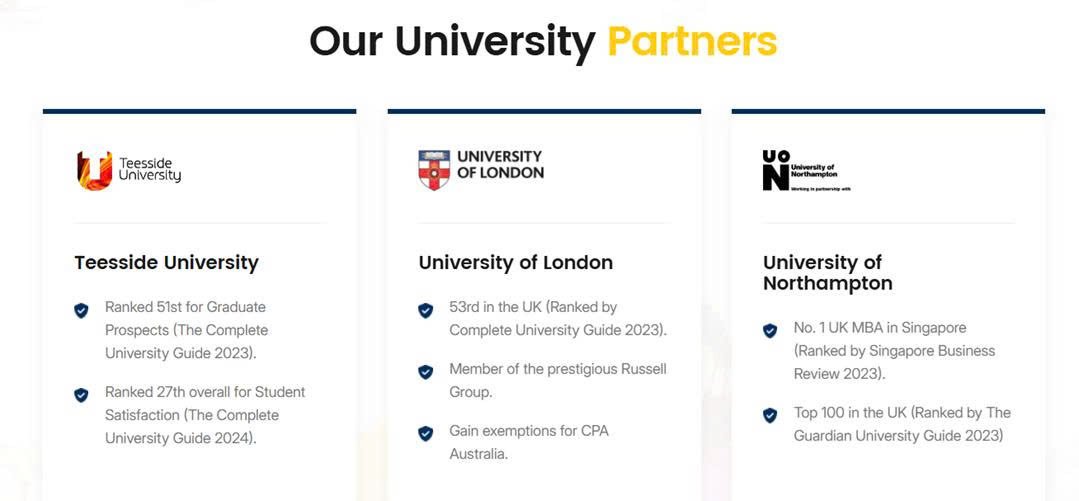 - Các trường Đại học đối tác đều nằm trong Top 120 đến 250 các trường Đại học hàng đầu Thế giới (ĐH London UK, ĐH Northampton UK)