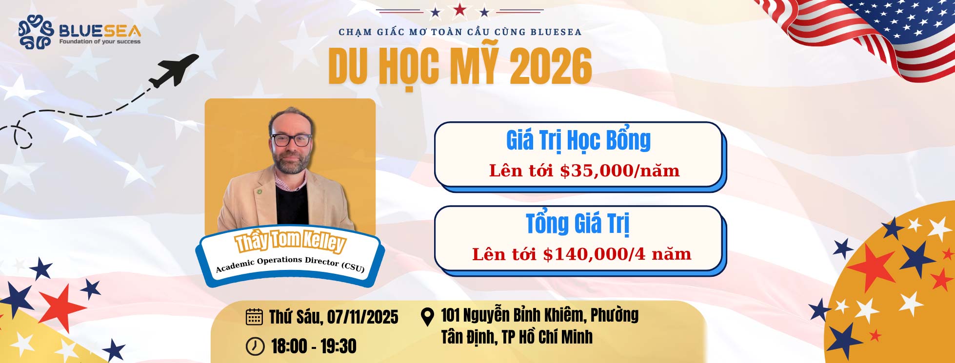Tối 18h00 ngày 07/11/2025, tại 101 Nguyễn Bỉnh Khiêm, Phường Tân Định, TP. Hồ Chí Minh hội thảo “Du học Mỹ 2026 – Chạm giấc mơ toàn cầu cùng BLUESEA” đã diễn ra thành công tốt đẹp,